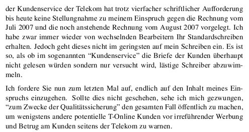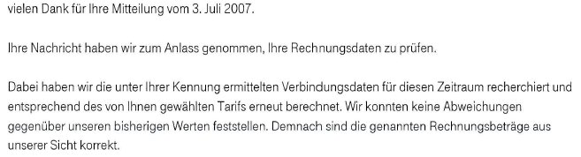 Langsam bekommt man das Gefühl, dass der Kundenservice der Telekom nur dazu da ist, lästige Briefeschreiber abzuwimmeln. Die Bitte, endlich etwas anderes als das übliche Standardschreiben zu schicken, war leider nicht von Erfolg gekrönt. Es kam doch wieder das Standardschreiben.