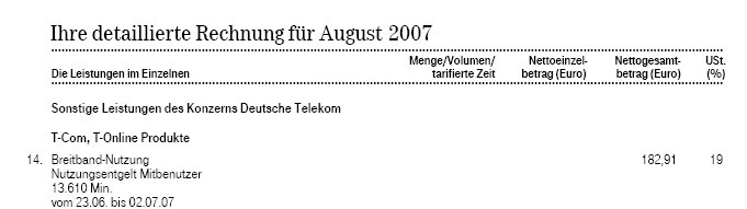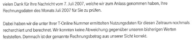 Ich bat die Telekom als nächstes, auf mein eigentliches Anliegen einzugehen, nämlich dass nicht einzusehen ist, warum trotz einer DSL Flatrate mehr als 300 Euro Verbindungsgebühren anfallen, nur weil anstelle der Mitbenutzernummer 0001 die 0002 eingetragen war. Als Antwort kam: