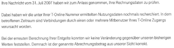Die Telekom stellt also fest, dass tatsächlich der Mitbenutzer den Zugang aufgebaut hatte (was niemand bezweifelt hatte). Auf mein Schreiben wird nicht weiter eingegangen.